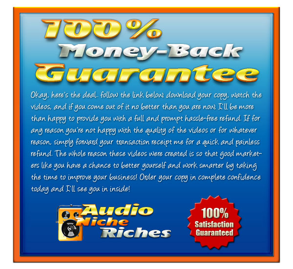 So order your copy of 'Audio Niche Riches' today in complete confidence! But just before you do, please rest assured that you are backed by a completely risk-free guarantee!..
