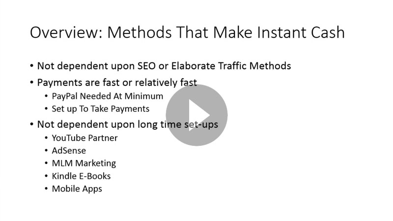 Specific "instant cash methods" that can put cash in your pocket NOW! ...and scale up to higher profits with little extra effort.